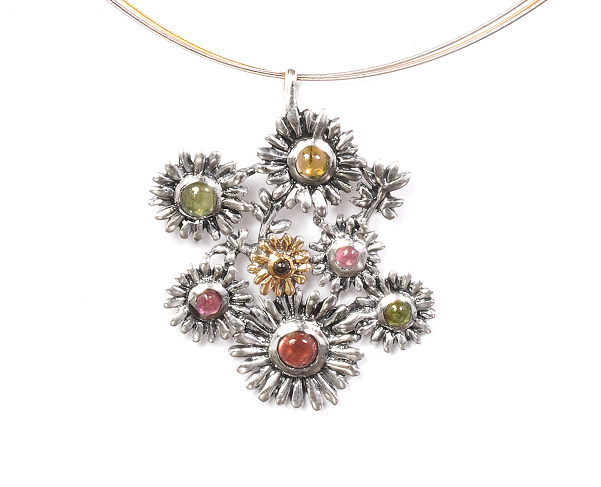 Colgante de plata de 925m, con flores cada una de ellas con una turmalina central, una de ellas rodeada por un bisel de oro de 9k.