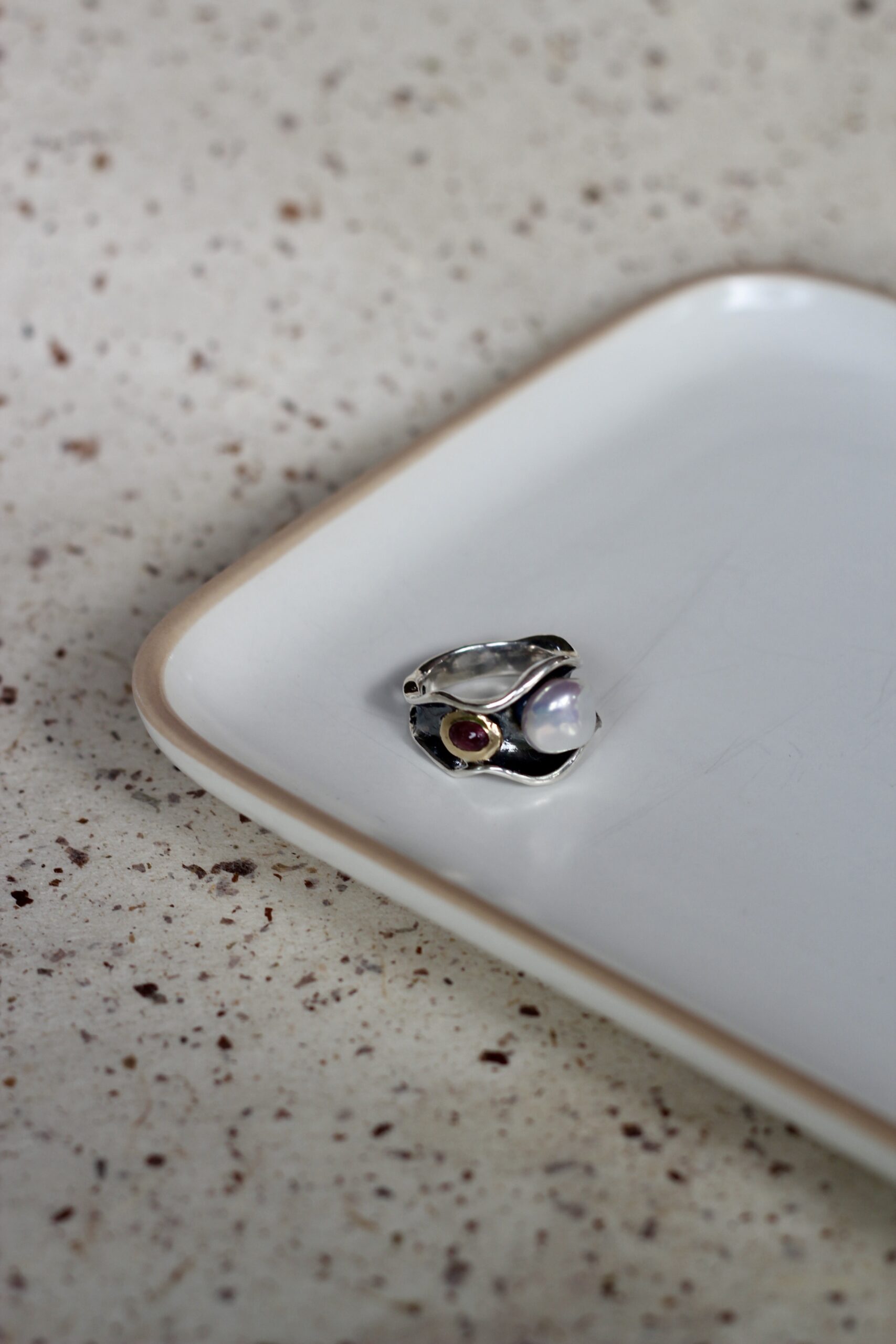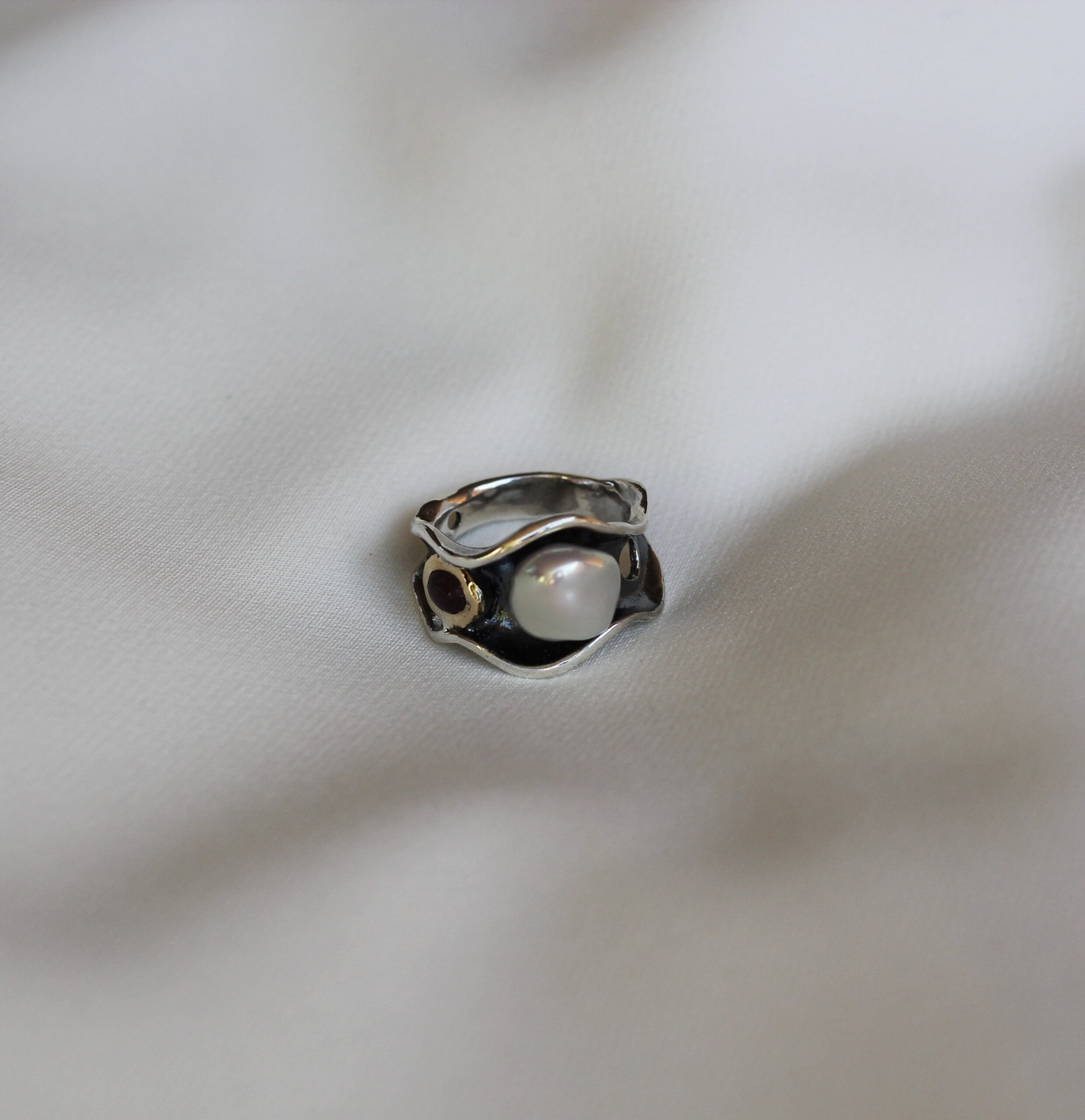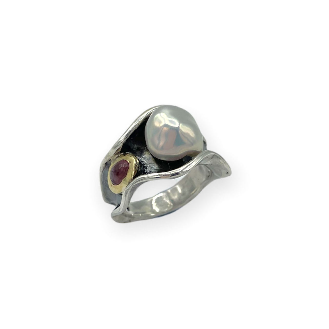Anillo de plata con perla Keshi, turmalina y bisel de oro de 9k.