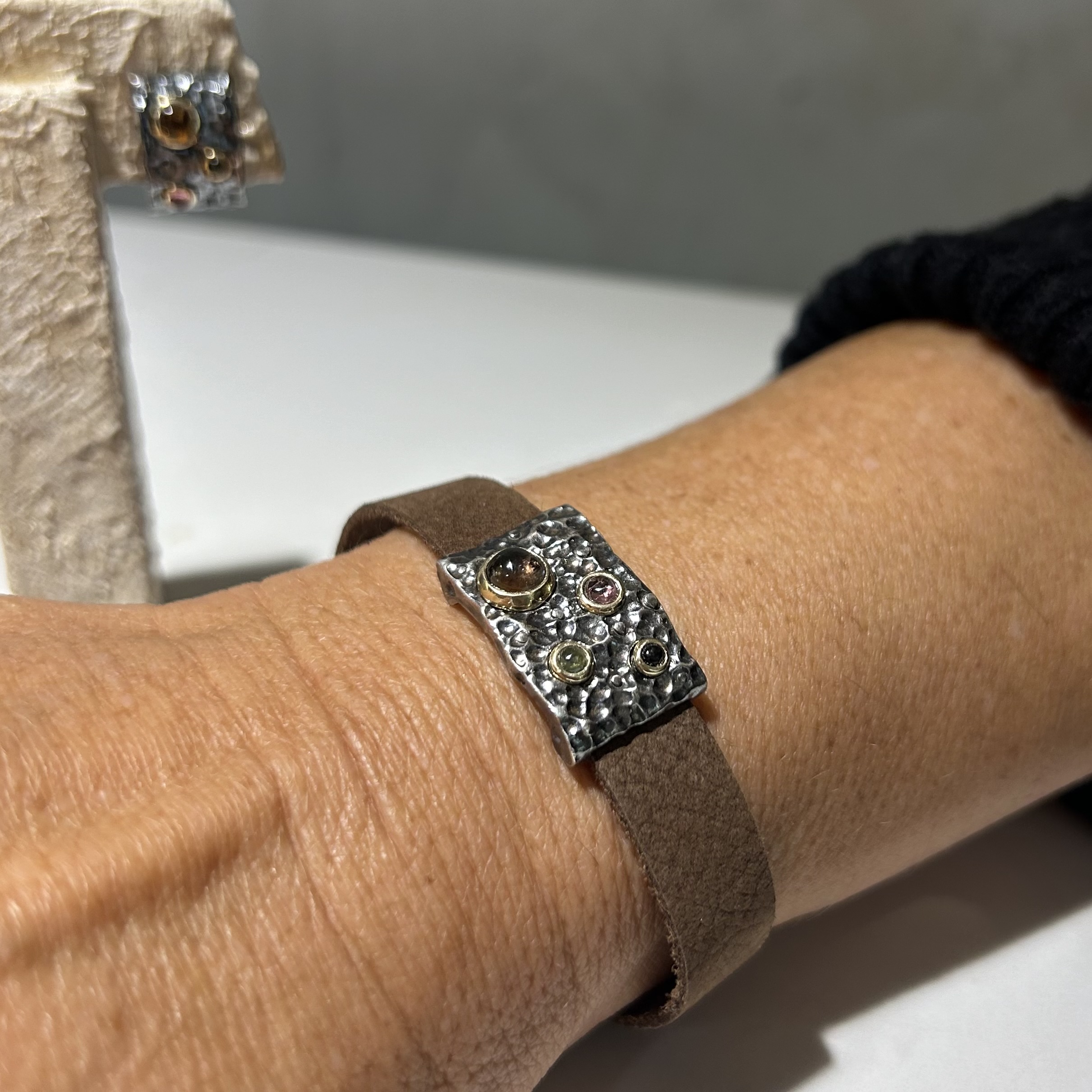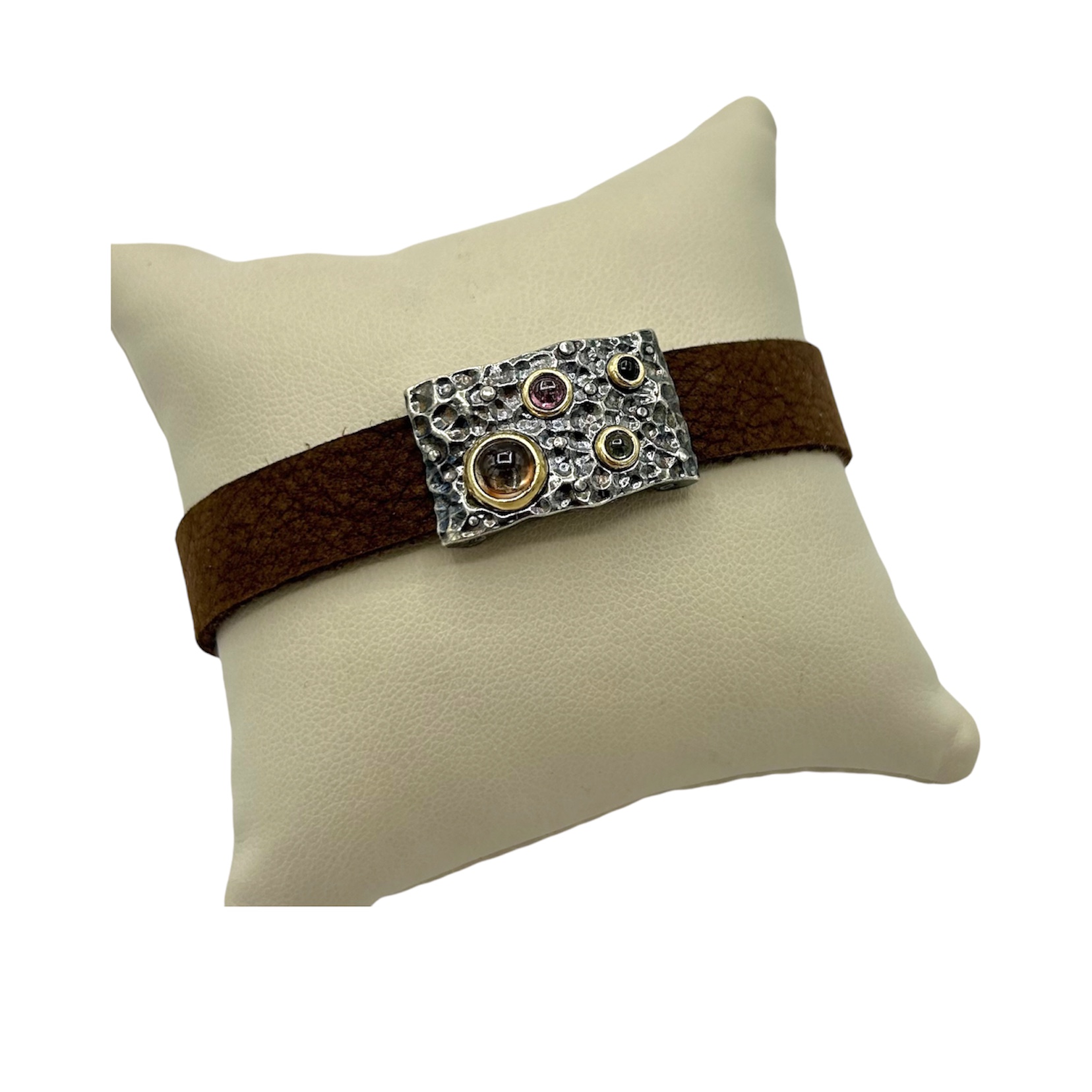 Pulsera de Plata de Primera Ley con detalles de oro 9k y turmalinas. Cuero marrón y cierre mosquetón.