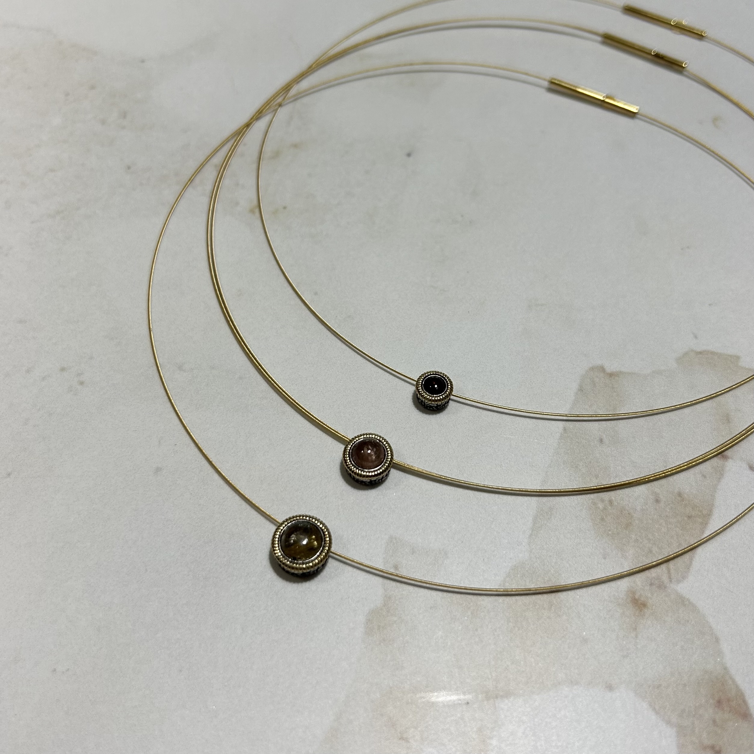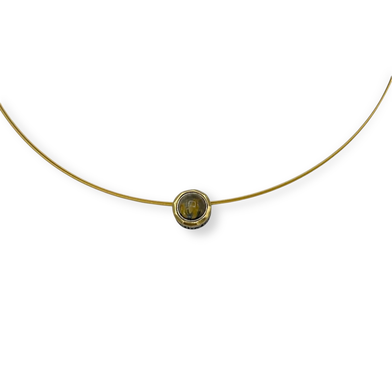 Colgante de plata con bisel martelé de oro 9k redondo, turmalina con un cable chapado. Cierre doble clic.