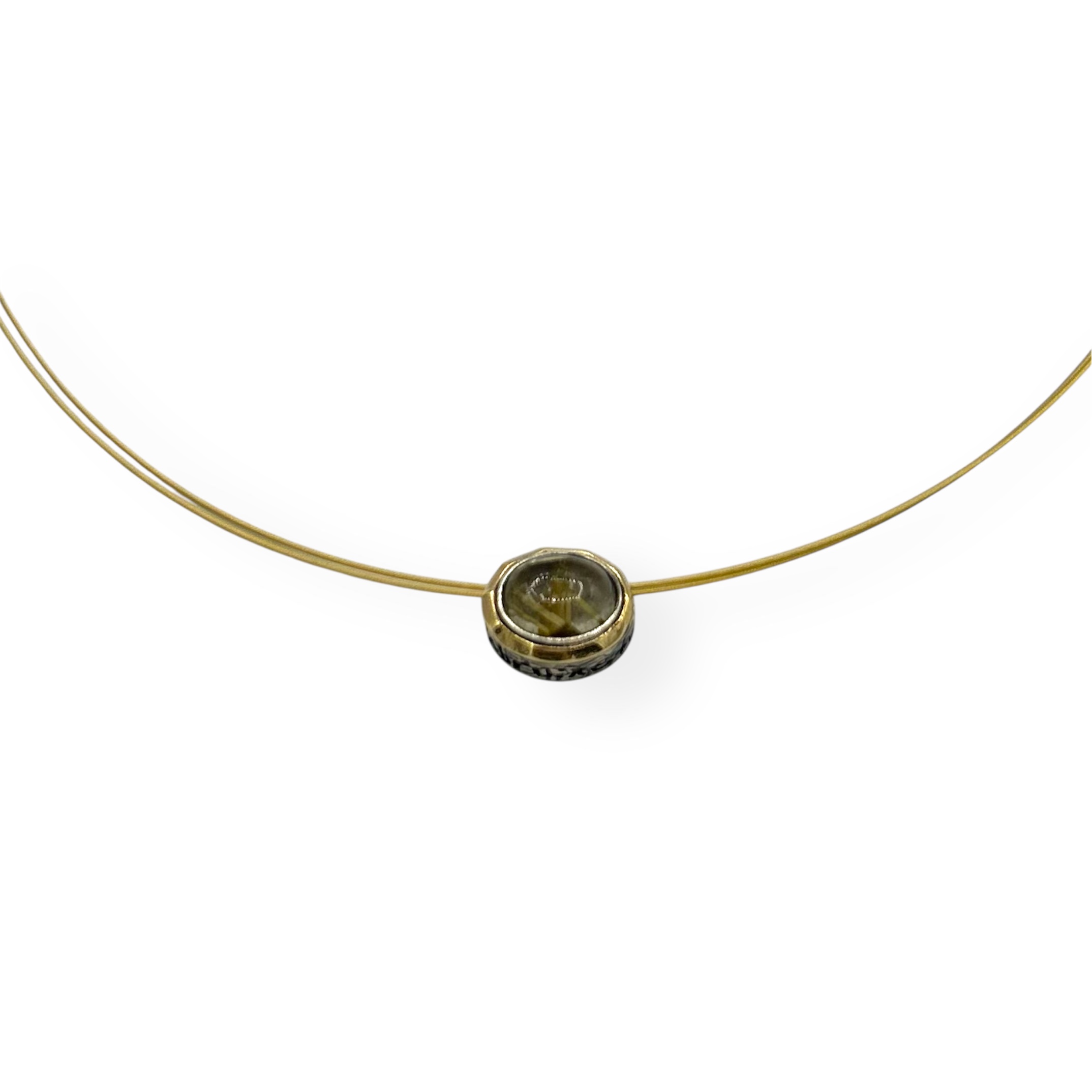 Colgante de plata con bisel martelé de oro 9k ovalado, turmalina con un cable chapado. Cierre doble clic.