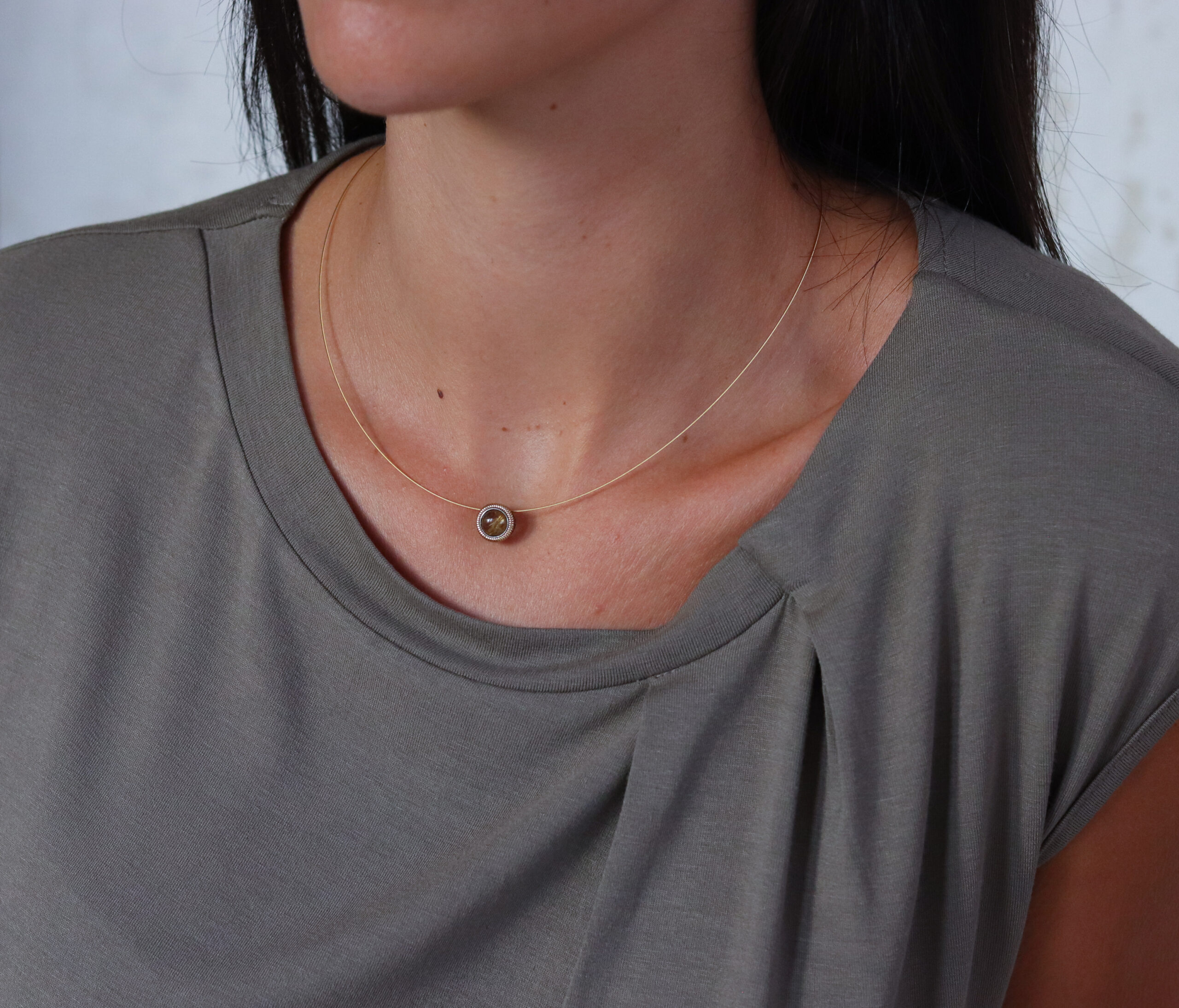 Colgante de plata con bisel de bolitas de oro 9k redondo, turmalina con un cable chapado. Cierre doble clic.