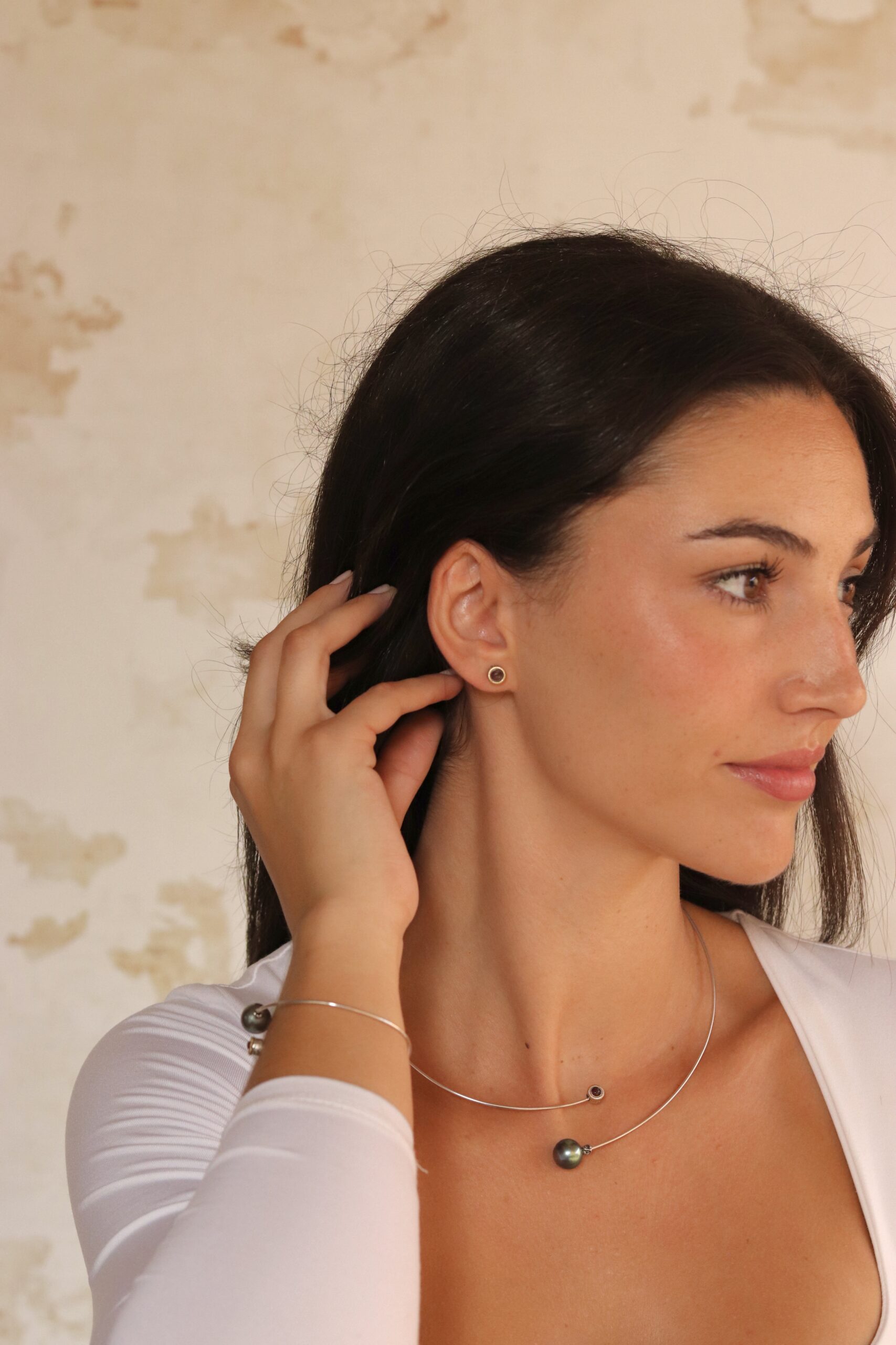 Pendientes de plata de primera ley con bisel redondo de oro 9k y turmalina. Disponible en varios colores.