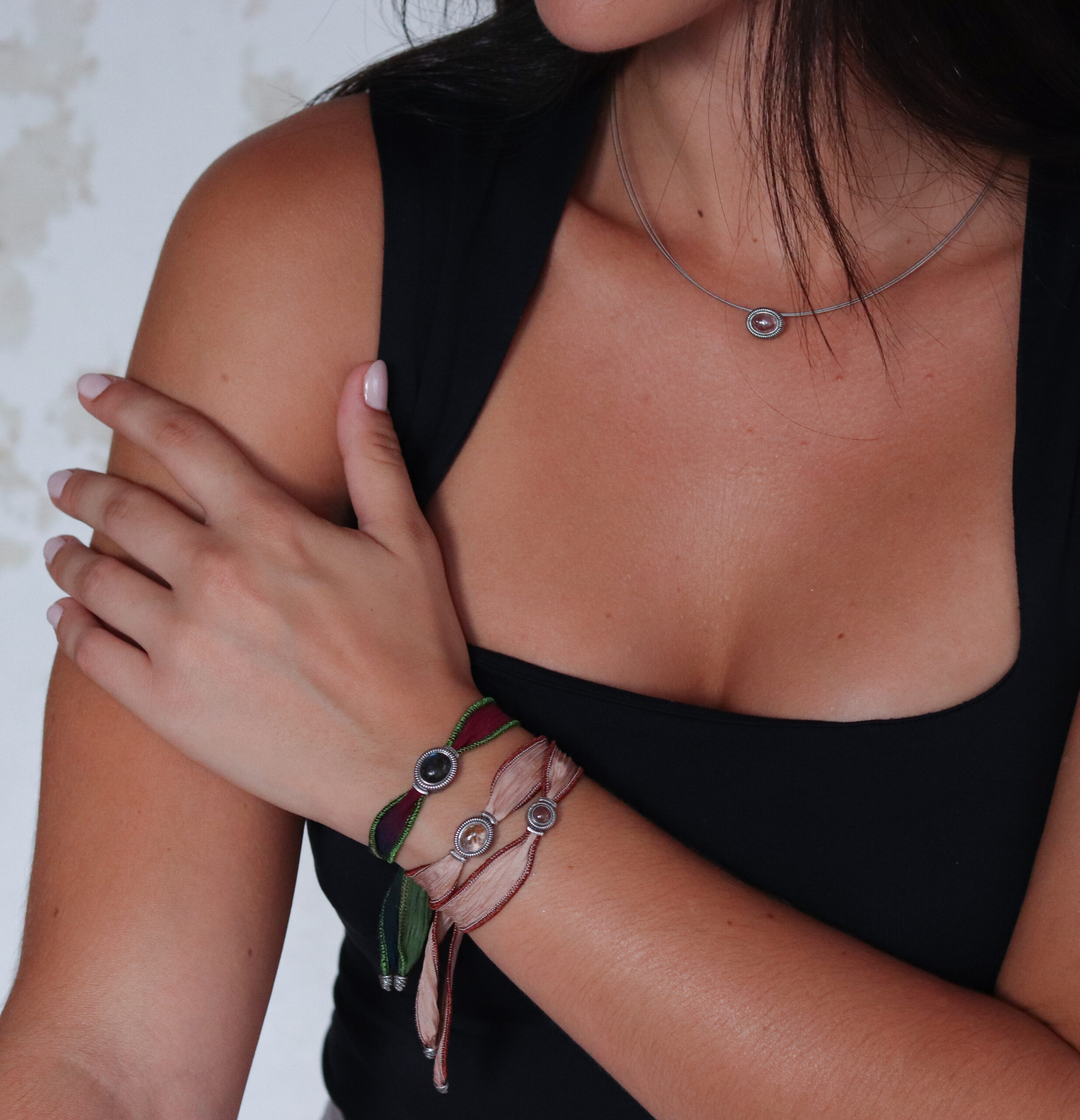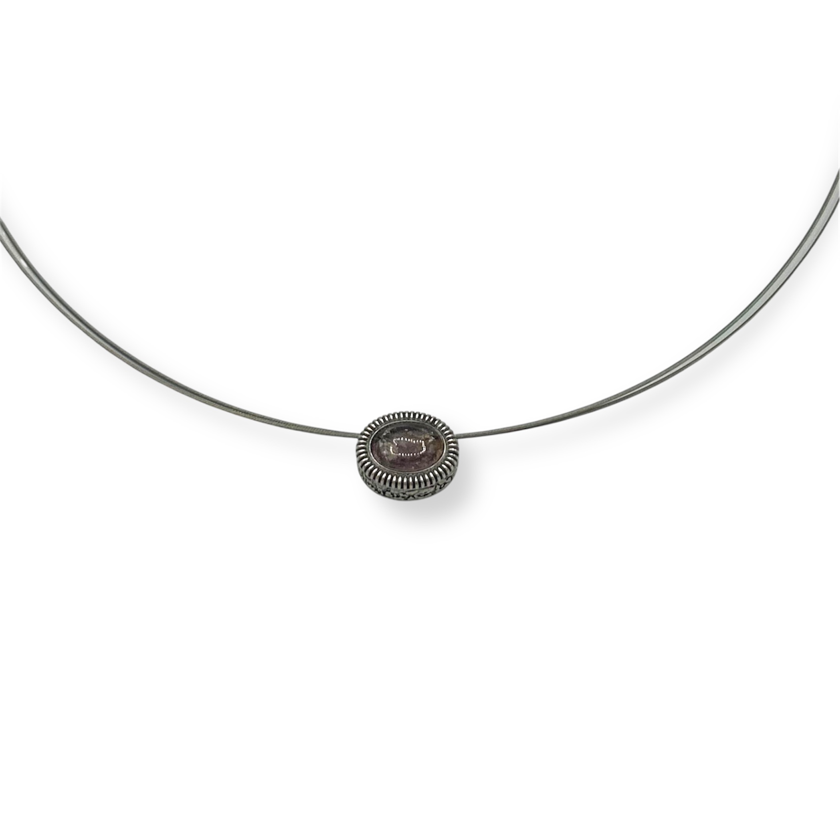 Colgante de plata con bisel de bolitas ovalado, turmalina con cable. Cierre doble clic.