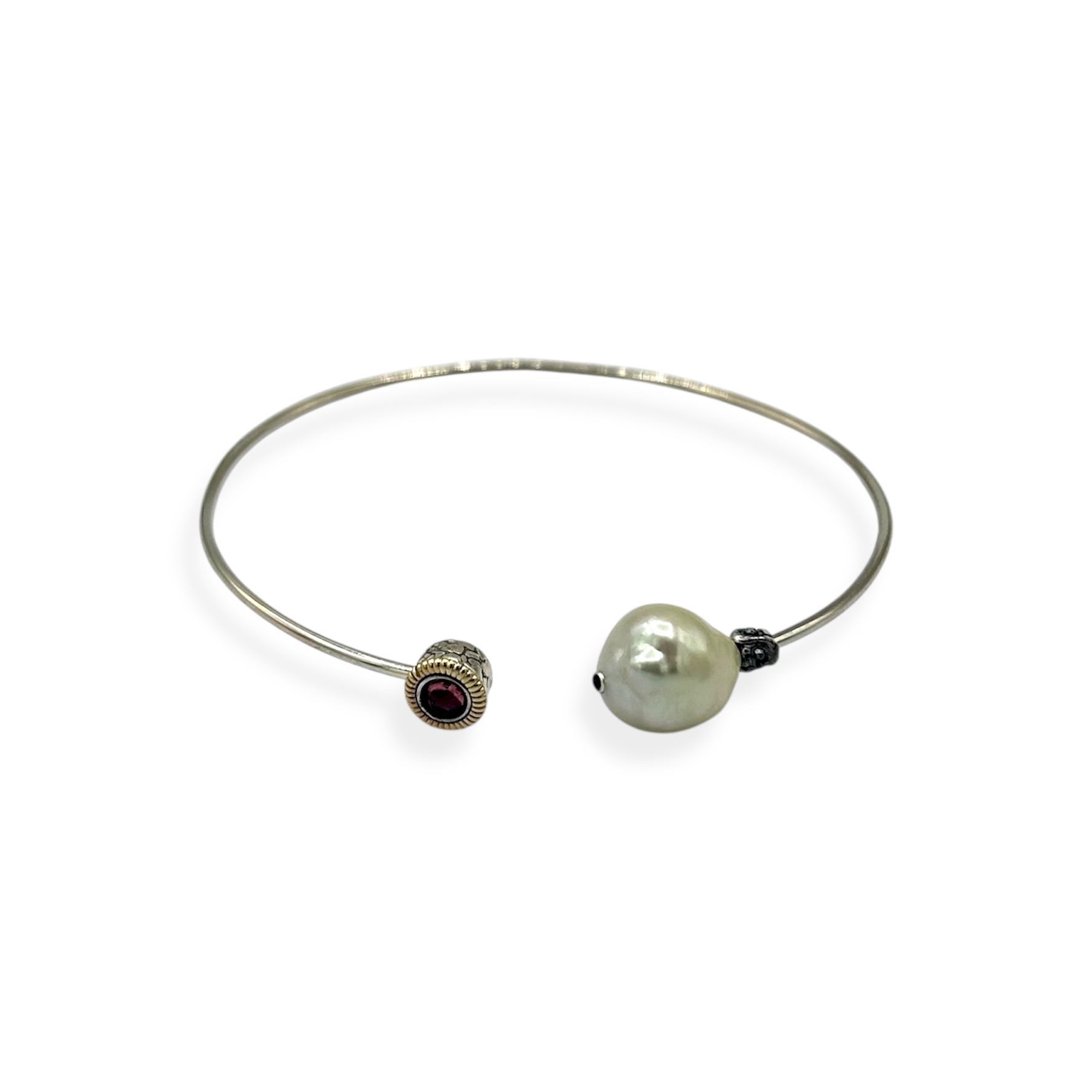 Pulsera de plata de primera ley con bisel en oro de 9k, turmalina y perla australina.