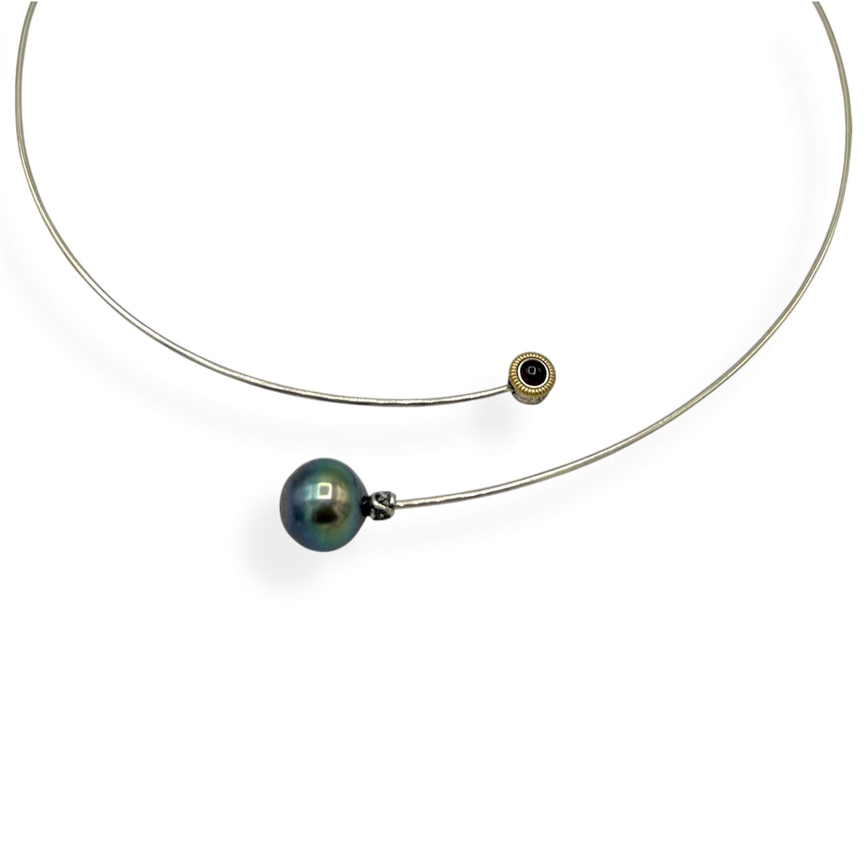 Colgante rígido de plata de primera ley con bisel de oro de 9k, turmalina y perla tahití.