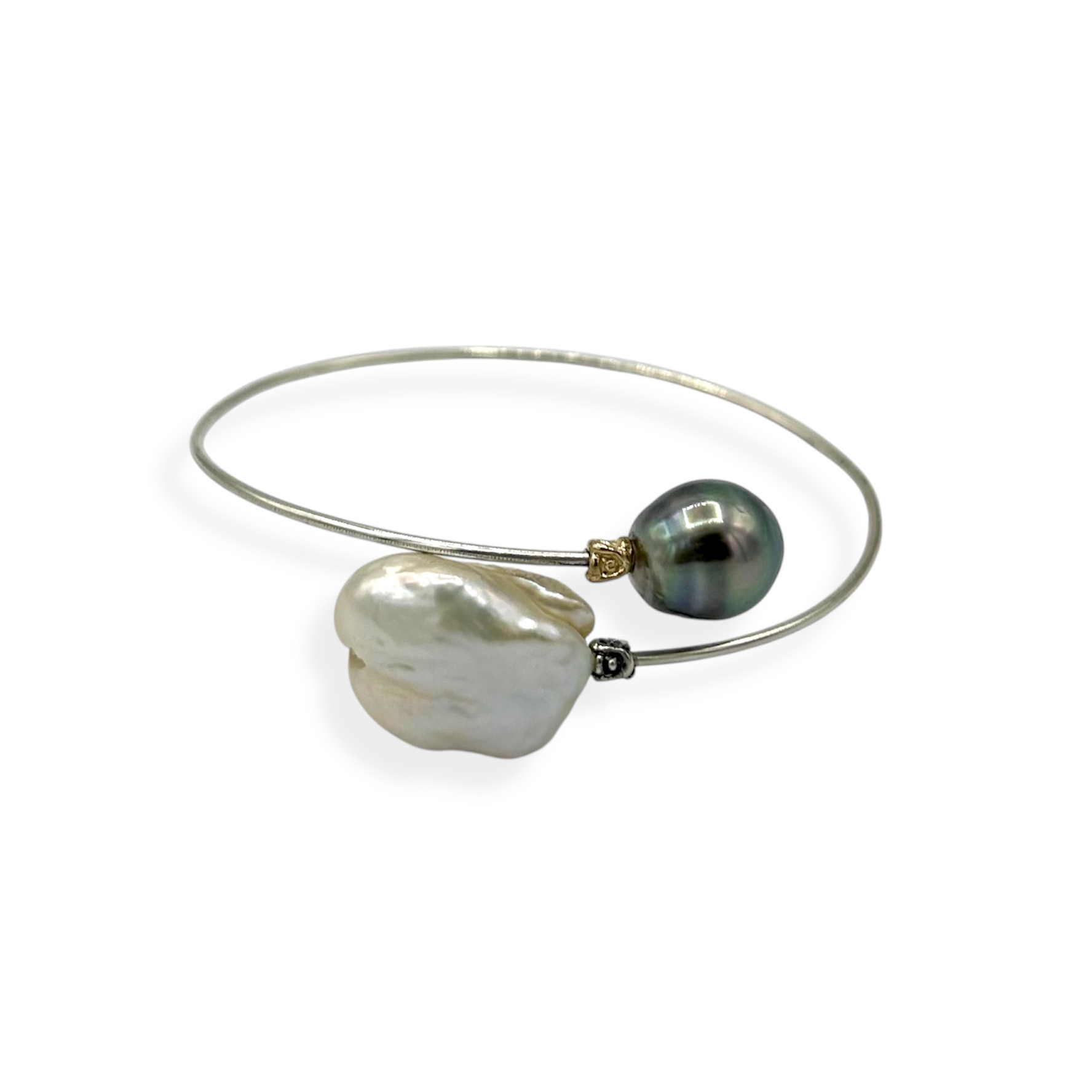 Pulsera doble de plata de primera ley con motivo en oro de 9k, perla barroca y perla tahití.