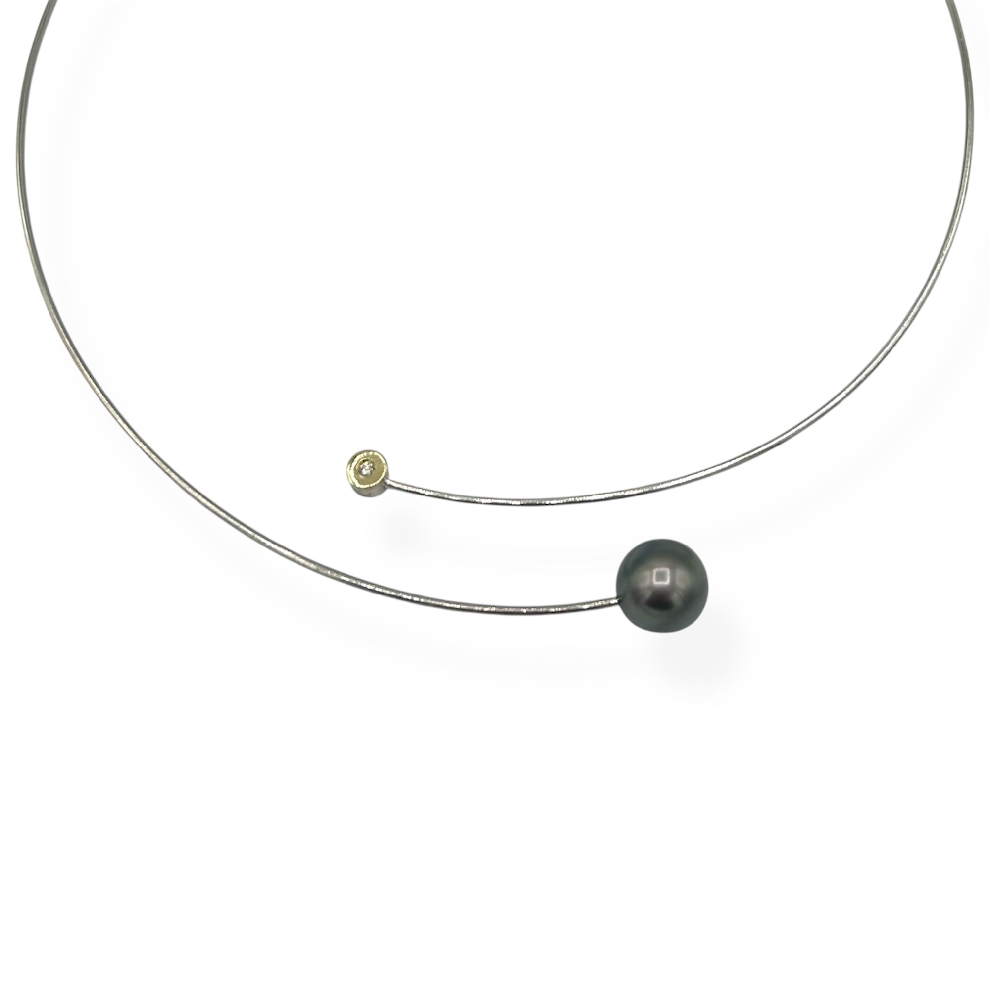 Colgante rígido de plata cruzado con un bisel de oro 9k, diamante talla brillante y una perla tahití.