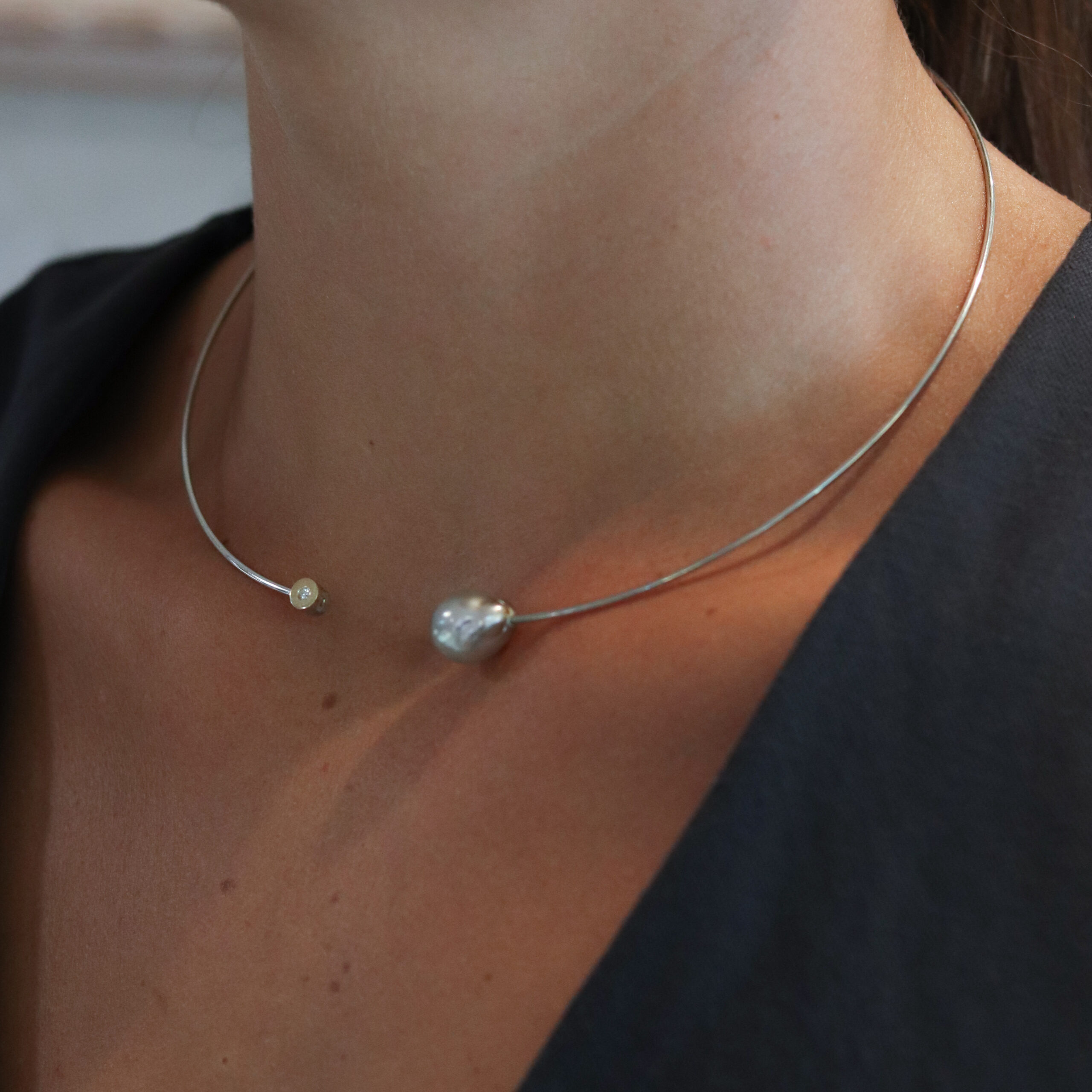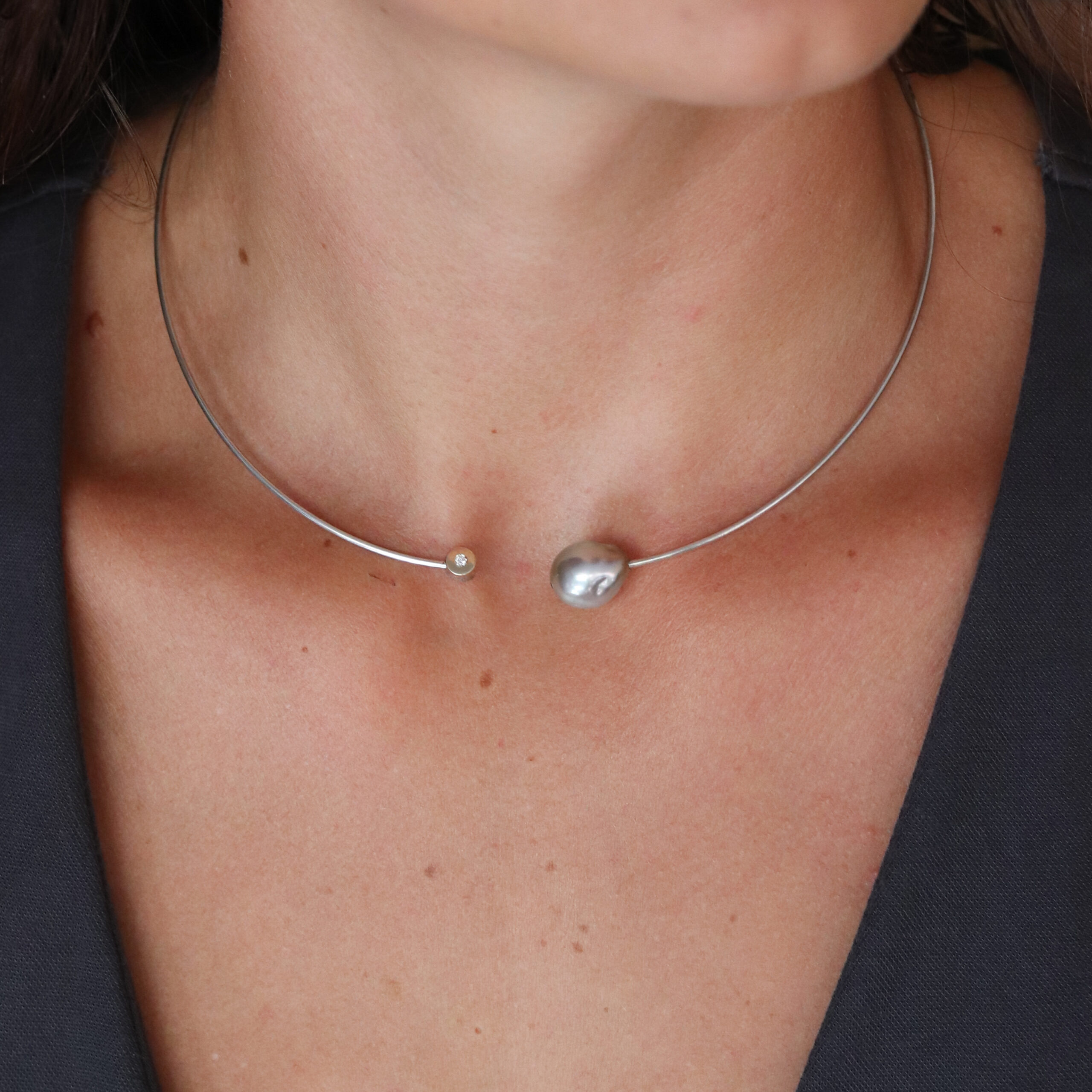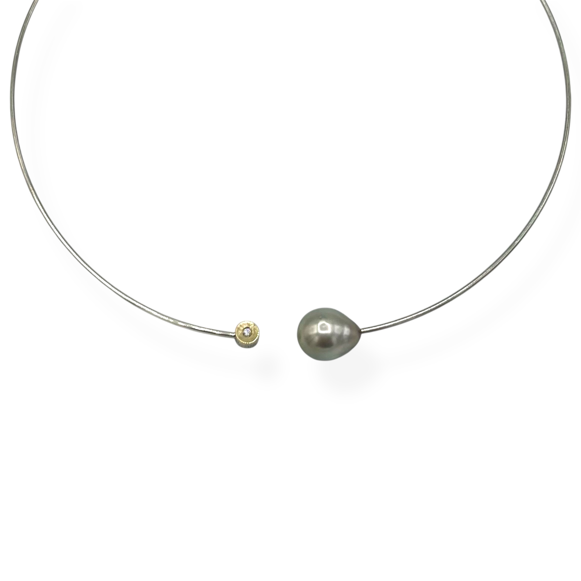 Colgante rígido de plata con bisel de oro de 9k, diamante talla brillante y perla tahtí.