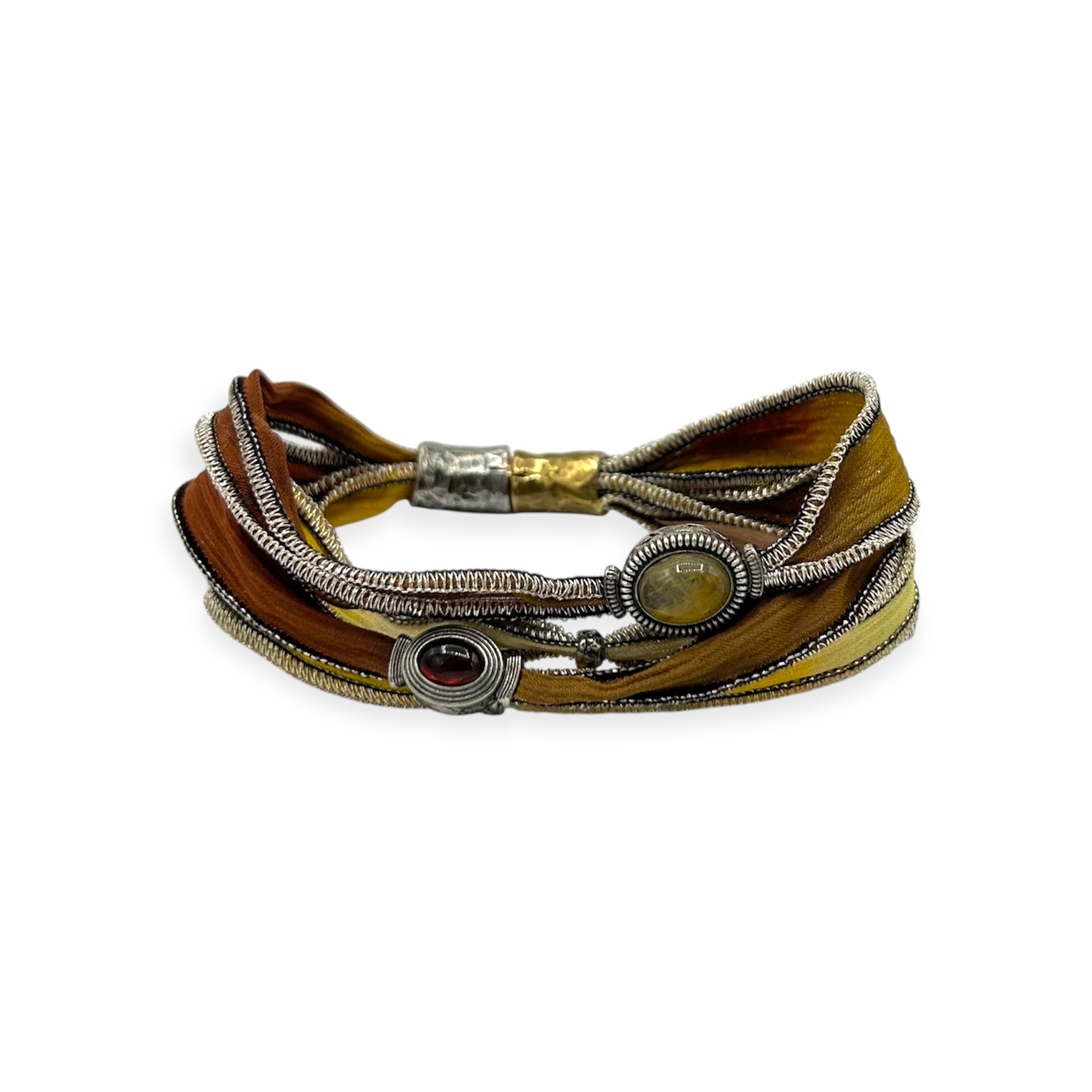 Pulsera de seda natural con monturas en plata de primera ley y turmalinas. Cierre bicolor redondo de imán.